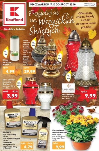 'Przygotuj się na Wszystkich Świętych' - nowa gazetka promocyjna sieci marketów Kaufland. Polecane promocje z gazetki Kaufland: Wkład parafinowy Angela - 4,99 zł. Chryzantema średniokwiatowa - 9,99 zł. Płyn czyszczący lub nabłyszczający nagrobki Sidolux 250 ml - 4,79 zł.…