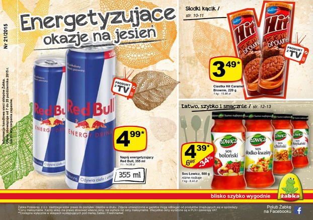 Nowa gazetka promocyjna sieci sklepów Żabka - "Energetyzujące okazje na jesień". Polecane promocje z gazetki Żabka: Napój energetyzujący Red Bull 355 ml - 4,99 zł. Ciastka Hit Caramel & Brownie - 3,49 zł. Sos Łowicz 500 g -…