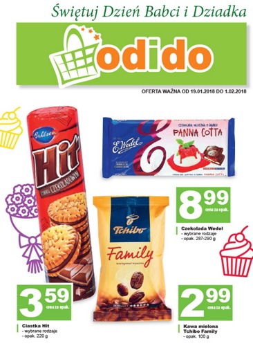 Nowa gazetka promocyjna sklepów Odido - "Świętuj Dzień Babci i Dziadka". Polecane promocje z gazetki Odido: Ciastka Hit 220 g - 3,59 zł. Czekolada Wedel 290 g - 8,99 zł. Kawa mielona Tchibo Family 100 g - 2,99 zł.…