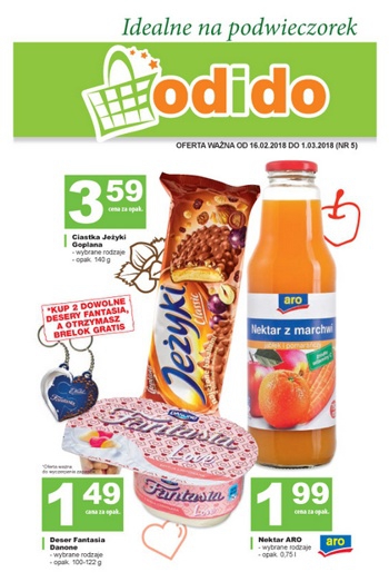 'Idealna na podwieczorek' - nowa gazetka promocyjna sklepów Odido. Polecane promocje z gazetki Odido: Ciastka Jeżyki Goplana 140 g - 3,59 zł. Deser Danone Fantasia wybrane rodzaje - 1,49 zł. Nektar Aro 750 ml - 1,99 zł. …