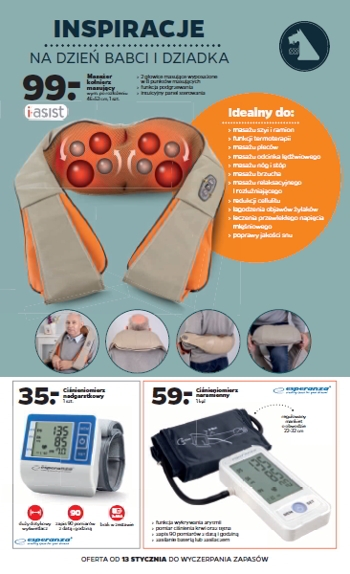 'Inspiracja na Dzień Babci i Dziadka' - nowa gazetka promocyjna sieci sklepów Netto. Polecane promocje z gazetki Netto: Masażer kołnierz masujący - 99 zł. Ciśnieniomierz nadgarstkowy Esperanza - 35 zł. Ciśnieniomierz naramienny Esperanza - 59 zł. Oferta…