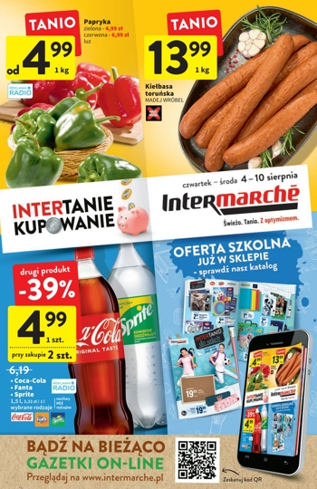 {loadposition linkIntermarche} 'Intertanie kupowanie' - nowa gazetka promocyjna sieci sklepów Intermarche Polecane promocje z gazetki Intermarche: Papryka zielona 1 kg - 4,99 zł. Kiełbasa toruńska Madej Wróbel 1 kg - 13,99 zł. Coca-Cola, Fanta lub Sprite 2x1,5 L -…