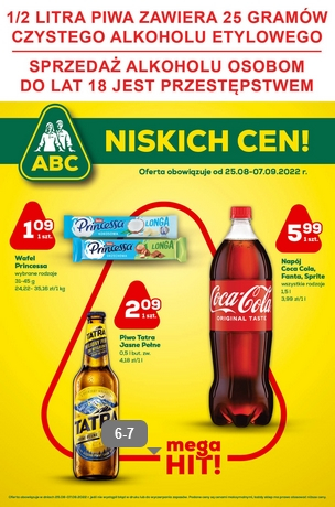 {loadposition linkABC} 'ABC niskich cen!' - nowa gazetka promocyjna sieci sklepów ABC. Polecane promocje z gazetki ABC: Wafel Princessa wybrane rodzaje - 1,09 zł. Napój Coca-Cola, Fanta lub Sprite 1,5 L - 5,99 zł. Piwo Tatra Jasne Pełne 500…