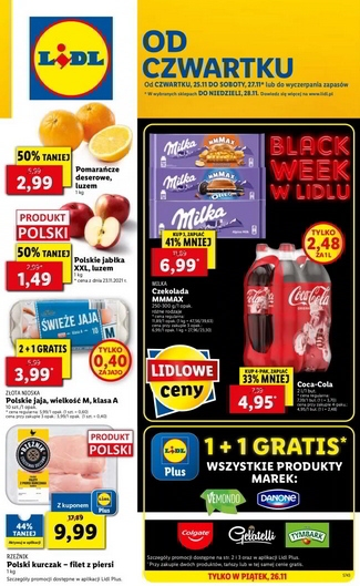 {loadposition linkLidl2} 'Od czwartku Black Week' - nowa gazetka promocyjna sieci sklepów Lidl. Polecane promocje z gazetki sklepów Lidl: Czekolada Milka 3x300 g - 20,97 zł. Coca-Cola 4x2 L - 19,80 zł. Pomarańcze deserowe 1 kg - 2,99 zł.…