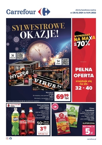 {loadposition linkCarrefour3} 'Sylwestrowe okazje!' - nowa gazetka promocyjna sieci marketów Carrefour. Polecane promocje z gazetki Carrefour: Wyrzutnia Hydra 36 strzałów - 69,99 zł. Wyrzutnia Virus 54 strzały - 69,99 zł. Coca-Cola, Fanta lub Sprite 2x850 ml - 6,24 zł.…