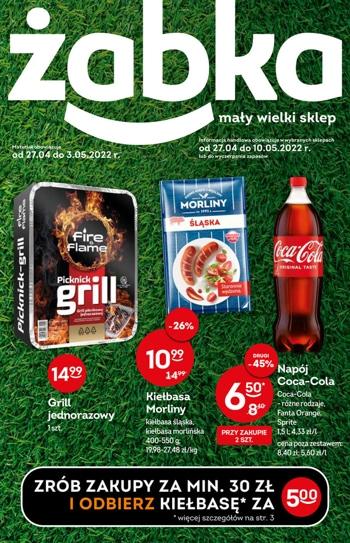 {loadposition linkZabka} Nowa gazetka promocyjna sieci sklepów Żabka. Polecane promocje z gazetki Żabka: Grill jednorazowy - 14,99 zł. Kiełbasa śląska Morliny 550 g - 10,99 zł. Napój Coca-Cola 2x1,5 L - 13 zł. Oferta ważna od środy…