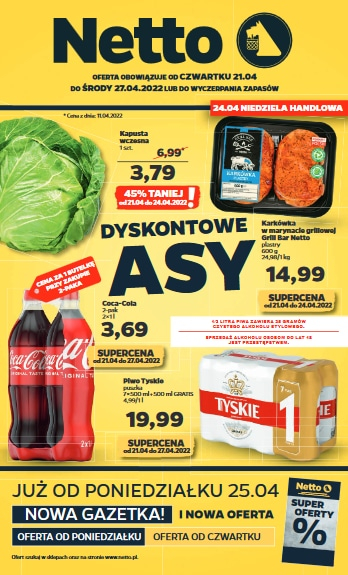{loadposition linkNetto} 'Dyskontowe asy' - nowa gazetka promocyjna sieci sklepów Netto. Polecane promocje z gazetki Netto: Kapusta wczesna 1 sztuka - 3,79 zł*. Coca-Cola 2x1 L - 7,38 zł. Piwo Tyskie 8x500 ml - 19,99 zł. * -…