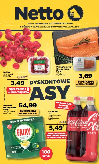 {loadposition linkNetto} 'Dyskontowe asy' - nowa gazetka promocyjna sieci sklepów Netto. Polecane promocje z gazetki Netto: Maliny 125 g - 3,49 zł*. Kapsułki do zmywarki Fairy 10 sztuk - 54,99 zł. Coca-Cola 2x2 L - 10,98 zł**. *…