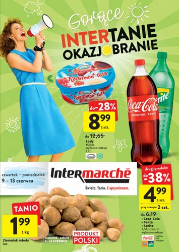 {loadposition linkIntermarche} 'Gorące Intertanie okazjobranie' - nowa gazetka promocyjna sieci sklepów Intermarche Polecane promocje z gazetki Intermarche: Lody Koral 1 L - 8,99 zł. Coca-Cola, Fanta lub Sprite 2x1,5 L - 9,98 zł. Ziemniaki młode 1 kg - 1,99…