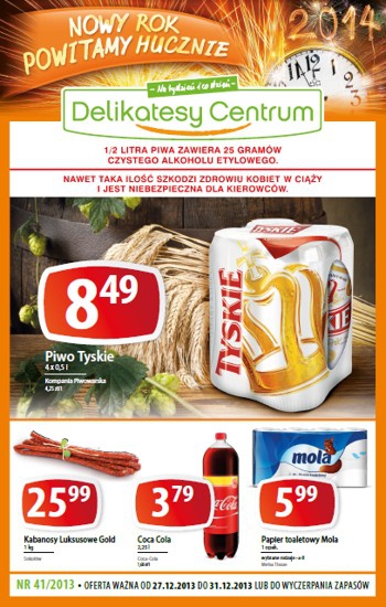 {loadposition linkDelikatesyCentrum} Nowa gazetka promocyjna Delikatesów Centrum - "Nowy Rok powitamy hucznie". Polecane promocje z gazetki Delikatesów Centrum: Piwo Tyskie 4x500 ml - 8,49 zł. Kabanosy luksusowe Gold 1 kg - 25,99 zł. Coca-Cola 2,25 L - 3,79 zł.…