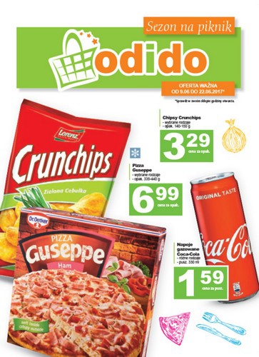 Nowa gazetka promocyjna sklepów Odido - "Sezon na piknik". Polecane promocje z gazetki Odido: Pizza Guseppe różne rodzaje - 6,99 zł. Chipsy Crunchips 140 g - 3,29 zł. Napój gazowany Coca-Cola 330 ml - 1,59 zł.…