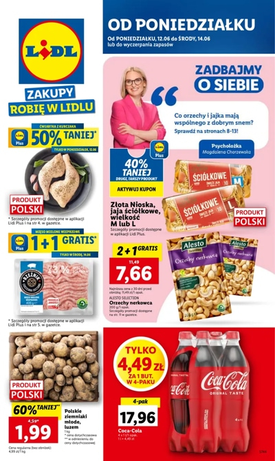 {loadposition linkLidl1} 'Zadbajmy o siebie od poniedziałku' - nowa gazetka promocyjna sieci sklepów Lidl. Polecane promocje z gazetki sklepów Lidl: Orzechy nerkowca Alesto Selection - 7,66 zł*. Polskie ziemniaki młode 1 kg - 1,49 zł. Coca-Cola 4x1 L -…