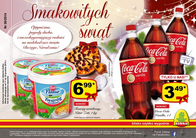 Nowa gazetka promocyjna sieci sklepów Żabka - "Smakowitych świąt". Polecane promocje z gazetki Żabka: Twaróg sernikowy Natur Zott 1 kg - 6,99 zł. Coca-Cola Vanilla 1 L - 3,49 zł. Lalka Sparkle Girlz - 19,99 zł. Oferta…