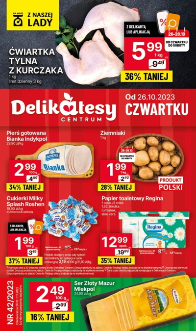 'Od czwartku' - nowa gazetka promocyjna Delikatesów Centrum. Polecane promocje z gazetki Delikatesów Centrum: Schab wieprzowy bez kości 1 kg - 17,99 zł*. Ćwiartka tylna z kurczaka 1 kg - 5,99 zł**. Ziemniaki 1 kg - 1,49 zł. …