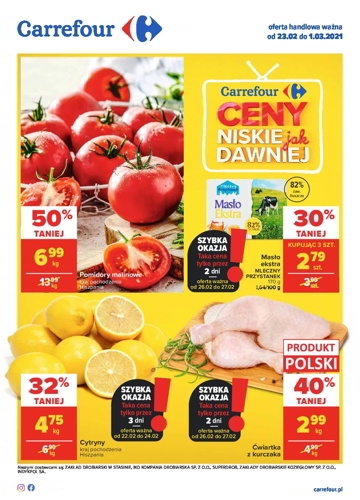 {loadposition linkCarrefour2} 'Ceny niskie jak dawniej' - nowa gazetka promocyjna sieci marketów Carrefour. Polecane promocje z gazetki Carrefour: Pomidory malinowe 1 kg - 6,99 zł. Cytryny 1 kg - 4,75 zł. Ćwiartka z kurczaka 1 kg - 2,99 zł.…