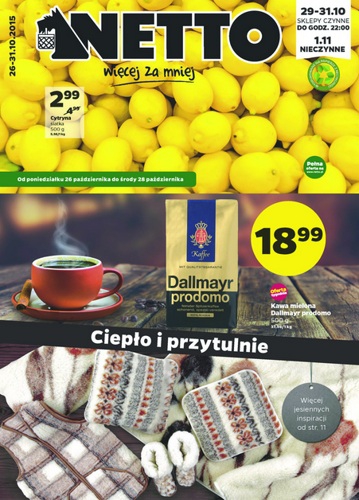 {loadposition linkNetto} Nowa gazetka promocyjna Netto - "Ciepło i przytulnie". Polecane promocje z gazetki Netto: Kawa mielona Dallmayr prodomo 500 g - 18,99 zł. Cytryna siatka 500 g - 2,99 zł. Kamizelka wełniana - 36,99 zł. Oferta…