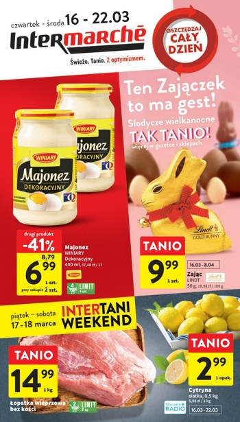 {loadposition linkIntermarche} 'Ten Zajączek to ma gest! Słodycze wielkanocne tak tanio!' - nowa gazetka promocyjna sieci sklepów Intermarche Polecane promocje z gazetki Intermarche: Majonez dekoracyjny Winiary 400 ml - 6,99 zł*. Zając Lindt 50 g - 9,99 zł. Cytryny…