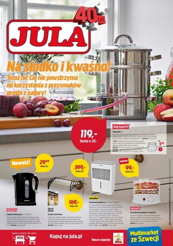 {loadposition linkJula} 'Na słodki i na kwaśno! Teraz nic Cię nie powstrzyma od korzystania z przysmaków prosto z natury!' - nowa gazetka promocyjna sieci handlowej Jula. Polecane promocje z gazetki Jula: Sokownik Menuett 5 L - 119 zł. Czajnik…