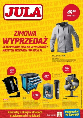 {loadposition linkJula} 'Zimowa wyprzedaż. Mega ceny!' - nowa gazetka promocyjna sieci handlowej Jula. Polecane promocje z gazetki Jula: Bluza męska rozpinana Bluewear - 24,99 zł. Czajnik elektryczny Menuett 1,7 L 2000 W - 39,99 zł. Wentylator kominkowy Anslut -…