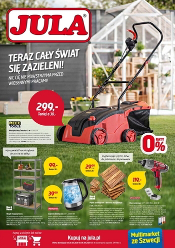 {loadposition linkJula} 'Teraz cały świat się zazieleni! Nic Cię nie powstrzyma przed wiosennymi pracami!' - nowa gazetka promocyjna sieci handlowej Jula. Polecane promocje z gazetki Jula: Wertykulator/aerator 2w1 Meec Tools 1300 W - 299 zł. Płytki podłogowe z drewna…