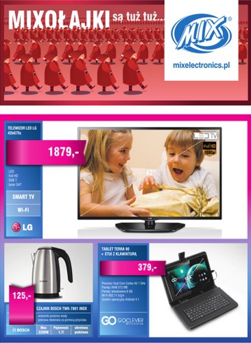 Aktualna gazetka promocyjna Mix Electronics - "Mikołajki są tuż tuż ...". Polecane promocje z gazetki Mix Electronics: Telewizor LED 42" LG 42LN575S - 1879 zł. Tablet GOCLEVER TERRA 90 (TABI921) + etui - 379 zł. Czajnik BOSCH TWK7801…