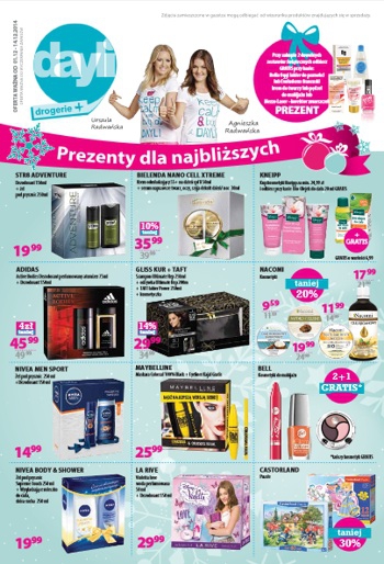 Nowa gazetka promocyjna drogerii Dayli - "Prezenty dla najbliższych". Polecane promocje z magazynu Dayli: Żel pod prysznic z płynem do kąpieli CARS 1 L - 22,99 zł. Mydło z pompką Palmolive 300 ml - 5,99 zł. Czapka Mikołaja…
