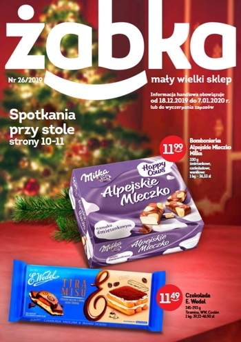 'Spotkania przy stole' - nowa gazetka promocyjna sieci sklepów Żabka. Polecane promocje z gazetki Żabka: Alpejskie Mleczko Milka 330 g - 11,99 zł. Czekolada E.Wedel 293 g - 11,49 zł. Donut świąteczny - 1,99 zł. …