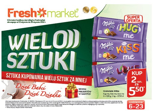 {loadposition linkFreshmarket} Nowa gazetka promocyjna Freshmarket - "Wielosztuki - sztuka kupowania wielu sztuk za mniej". Polecane promocje z gazetki Freshmarket: Czekolada Milka 100 g 2 sztuki - 5,50 zł. Faworytka Morliny 1 kg - 9,99 zł. Parówki wędzone Yano…