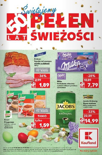 {loadposition linkKaufland} 'Świętujemy 50 lat' - nowa gazetka promocyjna sieci marketów Kaufland. Polecane promocje z gazetki Kaufland: Szynka od szwagra Krakus 100 g - 1,89 zł. Czekolada mleczna Milka 300 g - 7,79 zł. Przyprawa Knorr - 1,59…