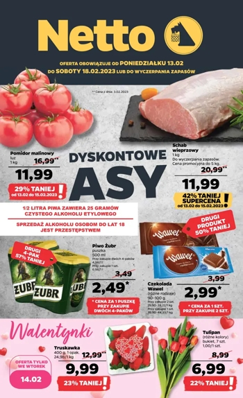 {loadposition linkNetto5} 'Dyskontowe asy' - nowa gazetka promocyjna sieci sklepów Netto. Polecane promocje z gazetki Netto: Pomidory malinowe 1 kg - 11,99 zł*. Schab wieprzowy 1 kg - 11,99 zł**. Czekolada Wawel 100 g - 2,99 zł***. *…