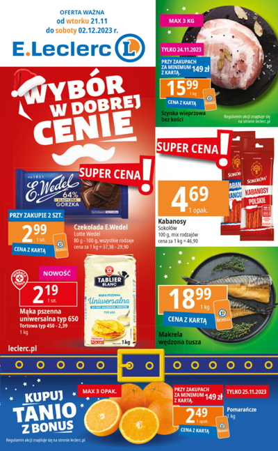 'Wybór w dobrej cenie' - nowa gazetka promocyjna sieci handlowej E.Leclerc. Polecane promocje z gazetki E.Leclerc: Czekolada Wedel 100 g - 2,99 zł*. Mąka pszenna uniwersalna typ 650 Tablier Blanc 1 kg - 2,19 zł. Kabanosy Sokołów 100 g…