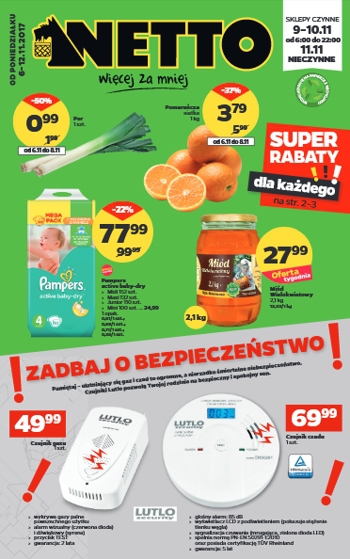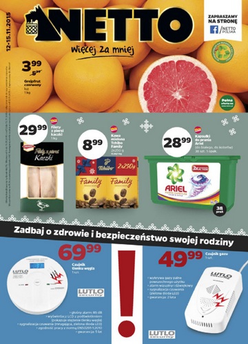 {loadposition linkNetto} Nowa gazetka promocyjna Netto - "Zadbaj o zdrowie i bezpieczeństwo swojej rodziny". Polecane promocje z gazetki Netto: Czujnik tlenku węgla - 69,99 zł. Czujnik gazu - 49,99 zł. Grejpfrut czerwony 1 kg - 3,99 zł. …