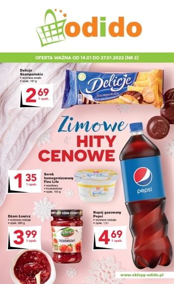 {loadposition linkOdido} 'Zimowe hity cenowe' - nowa gazetka promocyjna sklepów Odido. Polecane promocje z gazetki Odido: Delicje Szampańskie 147 g - 2,69 zł. Dżem łowicz 280 g - 3,99 zł. Napój gazowany Pepsi 1,5 L - 4,69 zł. …