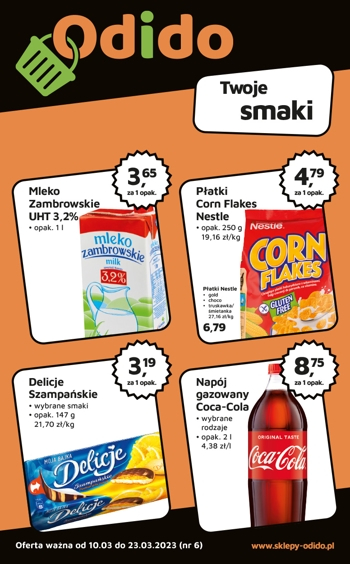 {loadposition linkOdido} 'Twoje smaki' - nowa gazetka promocyjna sklepów Odido. Polecane promocje z gazetki Odido: Mleko Zambrowskie 1 L - 3,65 zł. Płatki Corn Flakes Nestle 250 g - 4,79 zł. Delicje Szampańskie 147 g - 3,19 zł. …