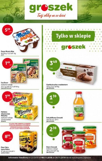 {loadposition linkGroszek} Nowa gazetka promocyjna sieci sklepów Groszek. Polecane promocje z gazetki Groszek: Deser Monte Max 4x100 g - 5,29 zł. Sos Knorr wybrane rodzaje - 1,49 zł. Dżem Groszek 290 g - 2,39 zł. Oferta…