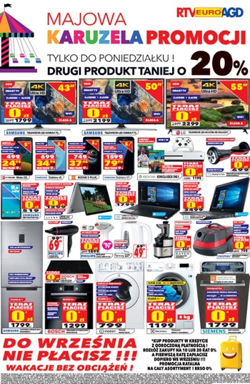 'Majowa karuzela promocji - drugi produkt taniej o 20%' - nowa gazetka promocyjna RTV EURO AGD. Polecane promocje z gazetki RTV EURO AGD: Telewizor 4K Ultra HD 43 cale Samsung UE43MU6172 - 1799 zł. Deskorolka elektryczna Manta Smart…