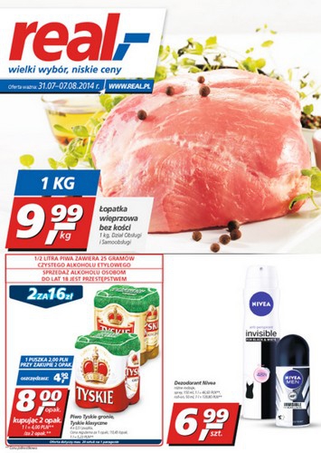 Nowa gazetka promocyjna sieci handlowej Real. Polecane promocje z gazetki Real: Łopatka wieprzowa bez kości 1 kg - 9,99 zł. Piwo Tyskie 8x500 ml - 16 zł. Dezodorant Nivea - 6,99 zł. Oferta ważna od 31.07 do…