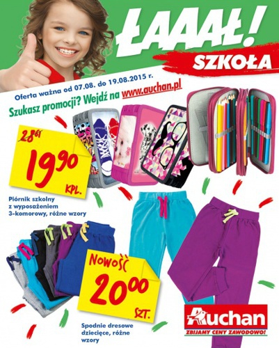 {loadposition linkAuchan} Nowa gazetka promocyjna Auchan - "Łaaał! Szkoła". Polecane promocje z gazetki Auchan: Piórnik szkolny z wyposażeniem 3-komorowy - 19,90 zł. Spodnie dresowe dziecięce - 20 zł. Długopis żelowy - 2,89 zł. Oferta ważna od 7.08 do…