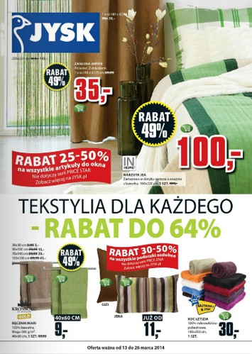 Nowa gazetka promocyjna JYSK - "Tekstylia dla każdego - rabat do 64%". Polecane promocje z gazetki Jysk: Rabat do 25-50% na wszystkie artykuły do okna. Rabat 25% na wszystkie dodatki do zasłon. Rabat 25-50% na wszystkie prześcieradła. …