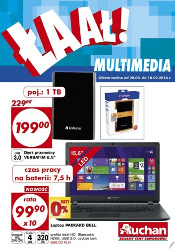 {loadposition linkAuchan} Nowa gazetka promocyjna Auchan - "Łaał! Multimedia". Polecane promocje z gazetki Auchan: Dysk przenośny Verbatim 2,5" 1 TB - 199 zł. Laptop Packard Bell - 999 zł. Telewizor LED 32" SAMSUNG 32H5303 - 999 zł. Oferta…