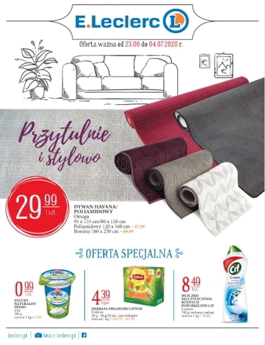 {loadposition linkEleclerc2} 'Przytulnie i stylowo' - nowa gazetka promocyjna sieci handlowej E.Leclerc. Polecane promocje z gazetki E.Leclerc: Dywan poliamidowy Omega 120x160 cm - 47,99 zł. Jogurt naturalny Zott Primo 180 g - 0,99 zł. Herbata piramidki Lipton…
