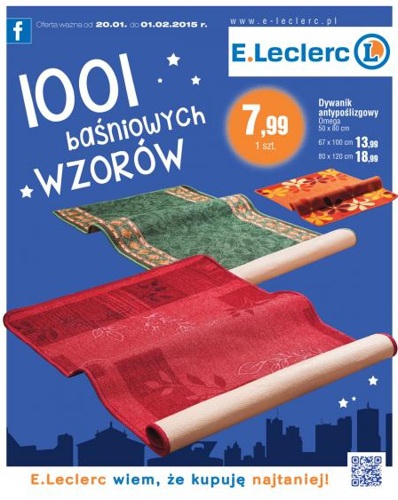 {loadposition linkEleclerc} Nowa gazetka promocyjna sieci handlowej E.Leclerc - "1001 baśniowych wzorów". Polecane promocje z gazetki E.Leclerc: Dywan antypoślizgowy Omega 50x80 cm - 7,99 zł. Dywan dziecięcy Omega 80x120 cm - 22,99 zł. Dywan Shaggy Solano 60x100 cm -…
