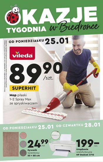 {loadposition linkBiedronka} 'Okazje tygodnia' - nowa gazetka promocyjna sieci sklepów Biedronka. Polecane promocje z gazetki sieci Biedronka: Mop płaski Vileda 1-2 Spray Max ze spryskiwaczem - 89,90 zł. Dywanik łazienkowy 50x80 cm - 24,99 zł. Urządzenie wielofunkcyjne HP DeskJet…