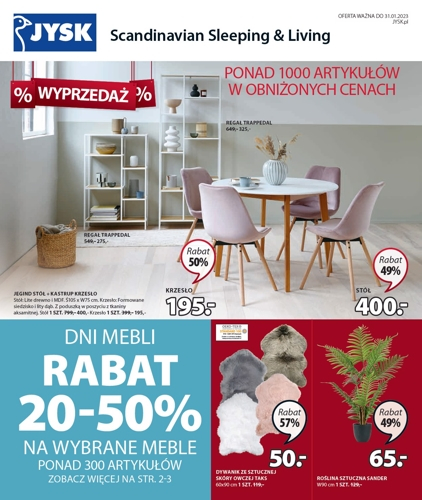 {loadposition linkJysk} 'Wyprzedaż. Ponad 1000 artykułów w obniżonych cenach' - nowa gazetka promocyjna sieci sklepów JYSK. Polecane promocje z gazetki Jysk: Stół Jegind śr 105 cm - 400 zł. Krzesło Kastrup - 1955 zł. Dywanik ze sztucznej skóry owczej…