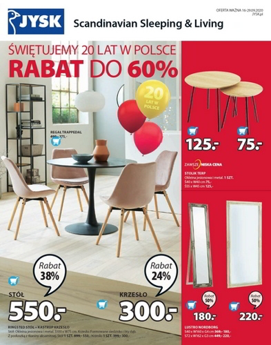 'Świętujemy 20 lat w Polsce' - nowa gazetka promocyjna sieci sklepów JYSK. Polecane promocje z gazetki Jysk: Rabat 30-49% na wybrane ręczniki. Rabat 30-50% na wybrane firany. Rabat 20-49% na wszystkie dywany. Oferta ważna od środy 16.09…