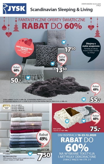 'Fantastyczne oferty świąteczne' - nowa gazetka promocyjna sieci sklepów JYSK. Polecane promocje z gazetki Jysk: Rabat 20-60% na wszystkie dywany. Rabat 20-49% na wszystkie wazony. Rabat 30-60% na wybrane firany. Oferta ważna od środy 16.12 do środy…