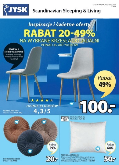 'Inspirqacje i świetne oferty' - nowa gazetka promocyjna sieci sklepów JYSK. Polecane promocje z gazetki Jysk: Rabat 20-49% na wybrane krzesła do jadalni. Rabat 20-49% na wszystkie dywany. Rabat 20-49% na wszystkie ceraty. Oferta ważna od środy…