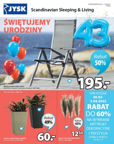 {loadposition linkJysk2} 'Świętujemy urodziny' - nowa gazetka promocyjna sieci sklepów JYSK. Polecane promocje z gazetki Jysk: Rabat do 60% na wybrane artykuły dekoracyjne i tekstylia*. Rabat 20-49% na wszystkie sztuczne rośliny. Rabat 20-49% na wybrane dywany. * -…
