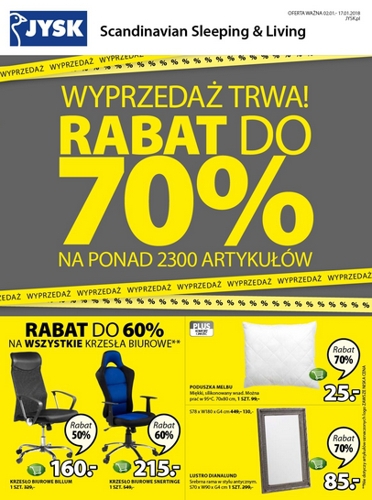Nowa gazetka promocyjna sieci sklepów JYSK - "Wyprzedaż trwa! Rabat do 70% na ponad 2300 artykułów". Polecane promocje z gazetki Jysk: Rabat do 60% na wszystkie krzesła biurowe. Rabat 20-60% na wszystkie dywany. Rabat do 70%…