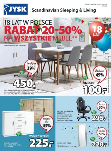 '18 lat w Polsce' - nowa gazetka promocyjna sieci sklepów JYSK. Polecane promocje z gazetki Jysk: Rabat 20-50%* na wszystkie meble. Rabat 30-60% na wszystkie poduszki Wellpur. Rabat 20-55% na szeroki wybór dywanów. * -…